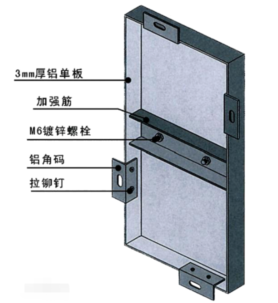 普通鋁單板其構造主要由面板、加強筋和角碼組成。表面一般經過鉻化等處理后,在采用氟碳或粉末噴涂處理。
